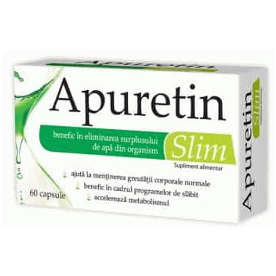 Apuretin Slim capsule ajuta la eliminarea excesului de apa din organism, la mentinerea unei greutati corporale optime si la detoxifierea organismului. Forma de prezentare: 60 capsule