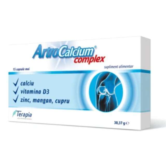 ArtroCalcium este un supliment alimentar ce conține minerale(calciu,cupru,magneziu,zinc și mangan)și vitamina D3.Acest produs poate fi folosit pentru a suplimenta aportul de calciu și vitamina D3 din alimentația,contribuind la menținerea densității normale a oaselor,la buna funcționare a inimii,mușchilor și sistemului imunitar,la protecția împotriva radicalilor liberi.