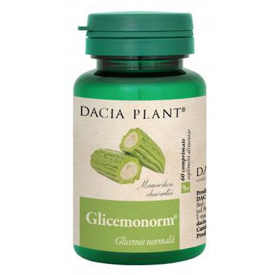 Glicemonorm comprimate - Glicemie normala Produsul sustine secretia de insulina la nivelul pancreasului, favorizeaza mentinerea concentratiei serice a glucozei in limitele normale, este recomandat in special persoanelor cu diabet zaharat. Castravetele amar din compozitie, cu puternicele efecte antidiabetice, scade nivelul glicemic, imbunatateste nivelul de zahar din sange. Forma de prezentare: flacon 60 comprimate